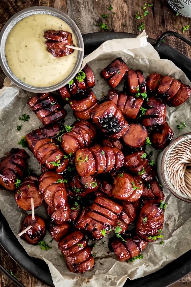Barbecue maple hasselbacked kransky bites make a flavourful appetiser that could be added to a charcuterie board or just enjoy them on their own.