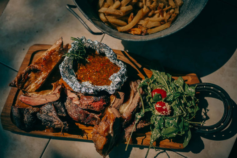 A classic, tasty South American style dish – perfectly seared steak served with a fresh zucchini chimichurri, crispy toasted flatbreads and a little antipasto on
