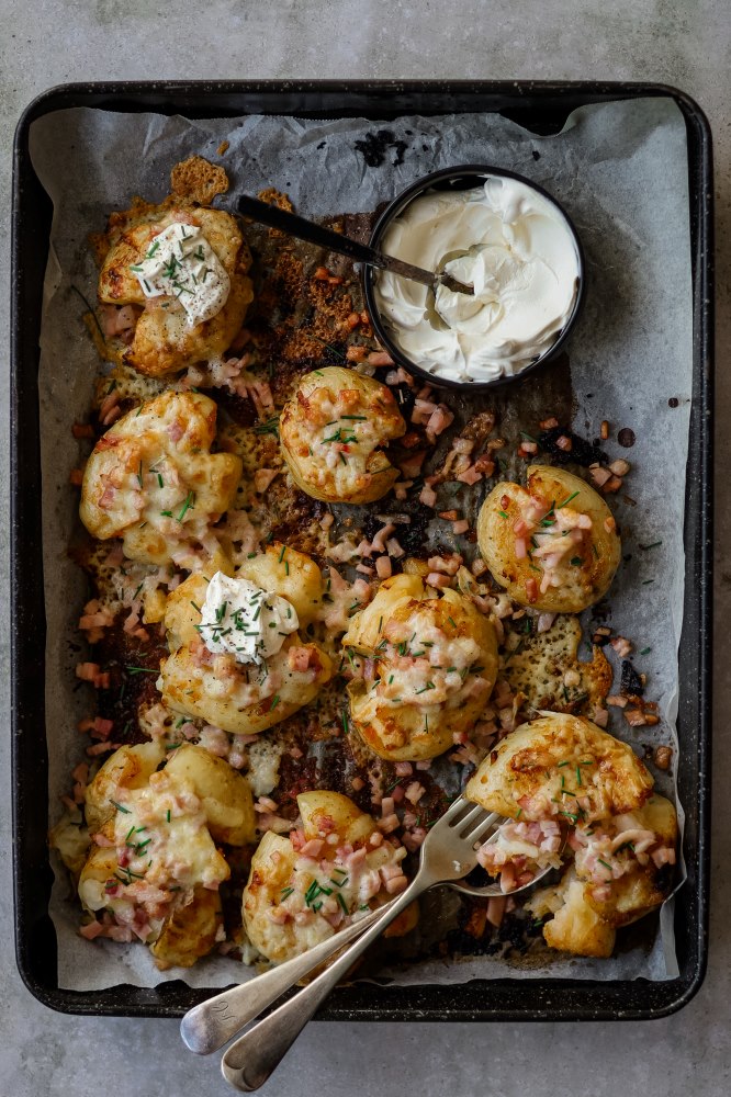 The title says it all ā a delicious cheesy, bacon-y potato side dish.