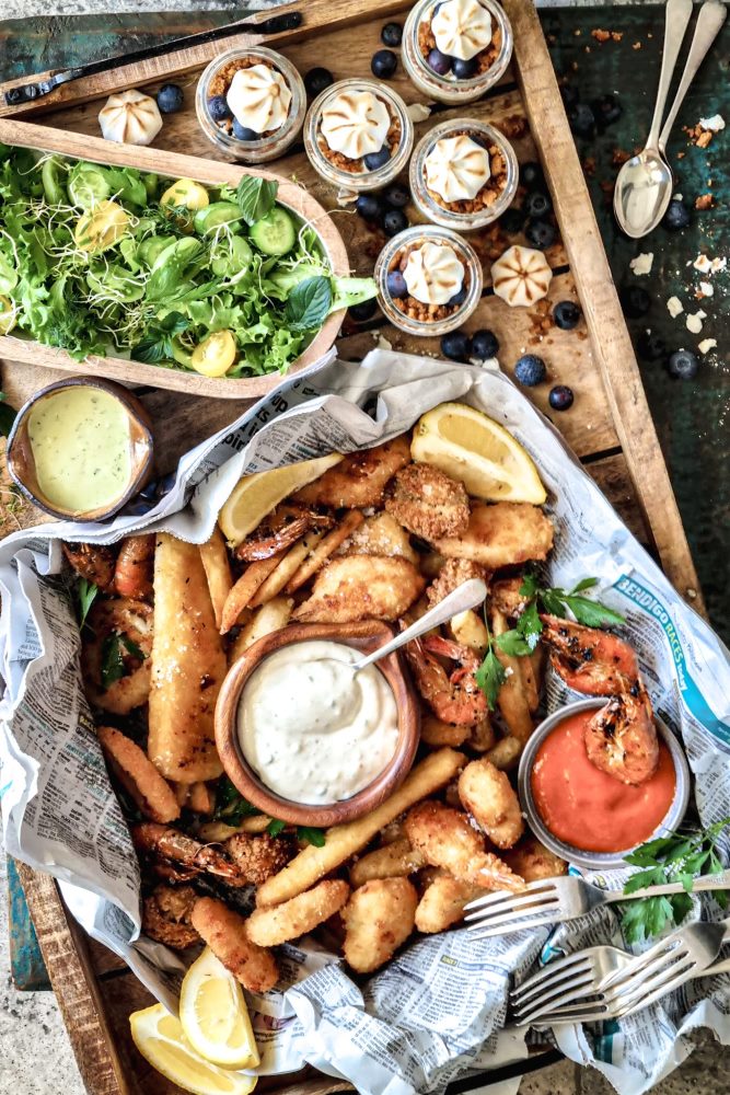 Streaky bacon-wrapped pork with roast veggies, garlic bread and gravy – an easy, delicious, traditional baked dinner-style meal. Swap out the pork for any other
