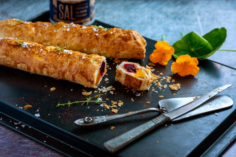 Tasty roasted vegetables in a puff pastry roll make a filling side dish to serve with a beef stew or other meat dishes. Easily portable