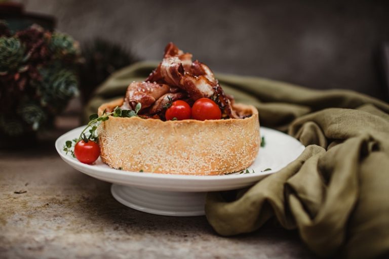 A delicious cheesy open pie with chicken, potato, mushrooms & sausage – kransky, chorizo or cabanossi! Freezes well.