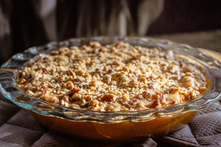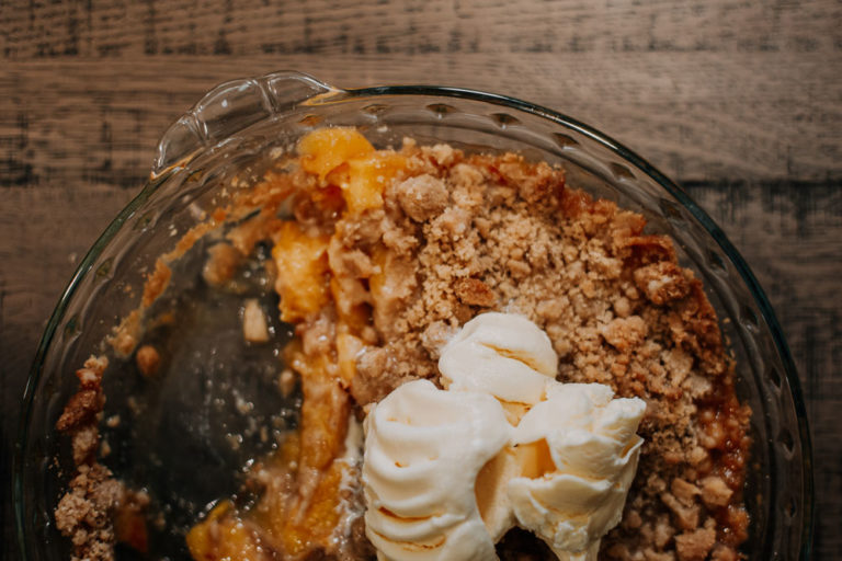 This dessert pairs peaches, the stone fruit so well known in the Southern states, with a crunchy topping. Every bite is like a serving of