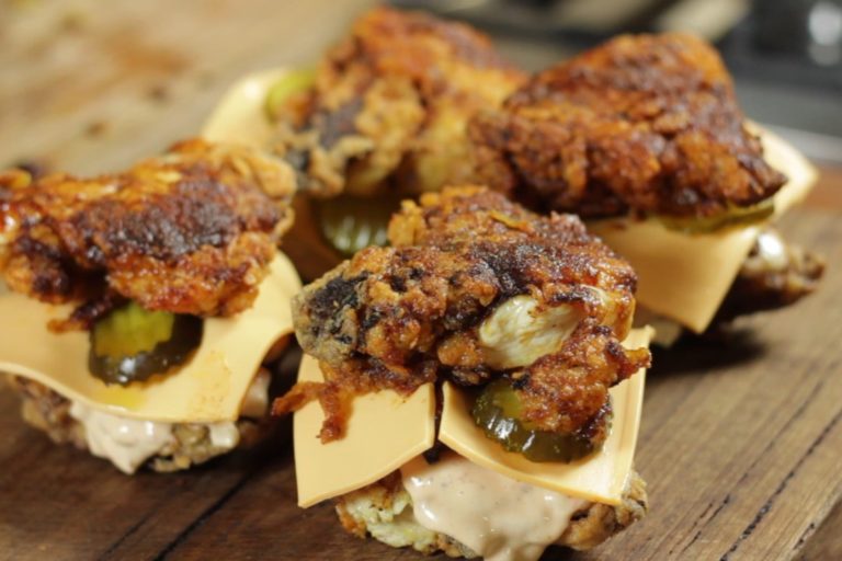 Spicy fried chicken sandwiched together with crispy bacon, cheese and pickles.