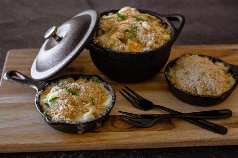 Southern macaroni and cheese is defined by fresh cream and cheese. This dish uses white Cheddar and Gruyere for a different flavour profile. To get