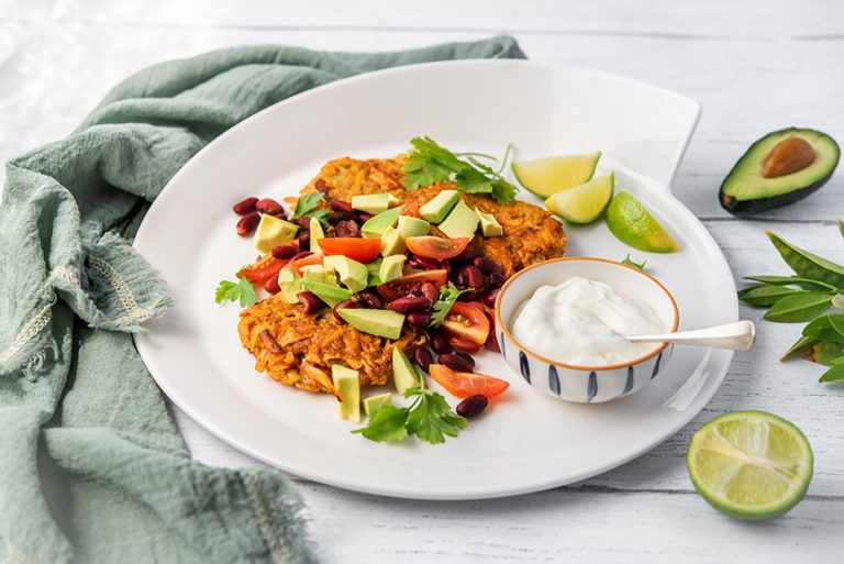 Leaving the skins on the sweet potatoes and serving with beans makes this a meal full of protein and fibre.