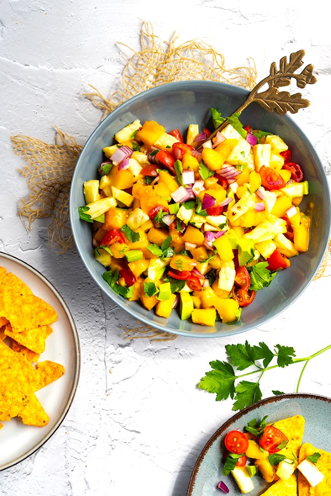 Sweet and tangy chicken served over a bed of rice and topped with a fresh homemade mango salsa.