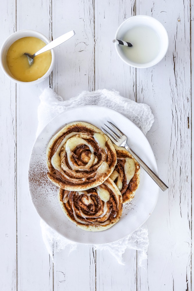 Pikelets, piped, swirled with a sugary cinnamon filling and topped with a vanilla cream cheese glaze. This tricky recipe takes a bit of practice but