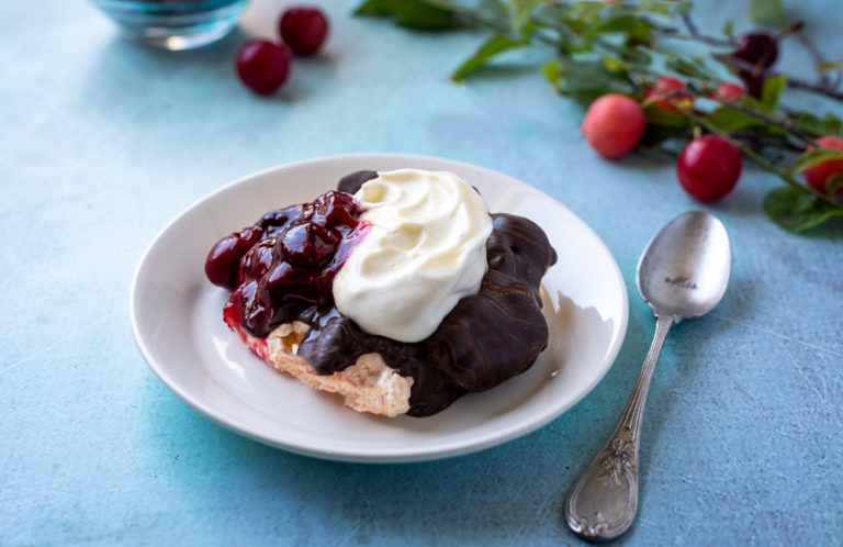 Dark chocolate dipped meringue shells filled with cream and fresh cherries.