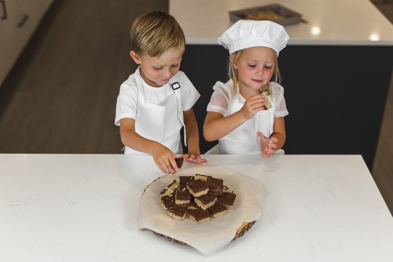 Peanut butter, biscuit and chocolate bars, very quickly made in microwave.