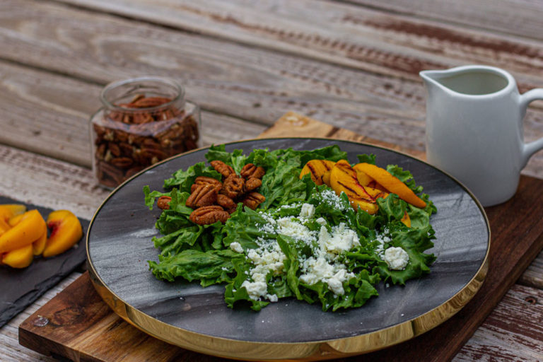 Two of Georgia’s main crops, pecans and peaches shine in this beautiful salad. The light and delicious homemade apple cider vinaigrette finishes this not-too-sweet combination