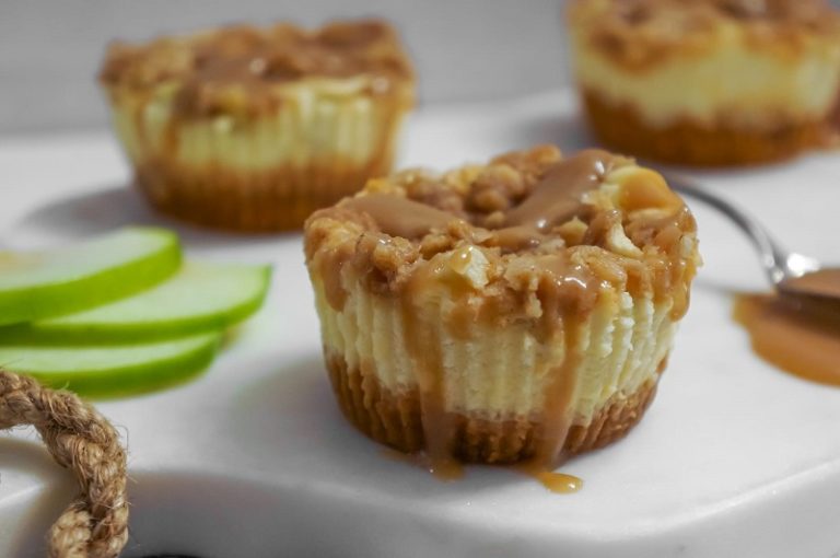 Apple crisp and cheesecake flavours all in one! Rich creamy cheesecake topped with apples and a cinnamon oat streusel topping. Delicious!