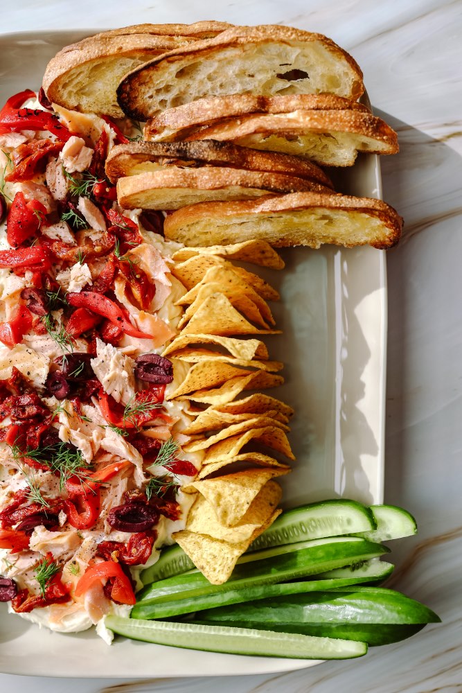 A lemon cream cheese and Greek yoghurt base topped with slices of smoked salmon, lemon zest, capers, red onion, fresh dill and parsley. Drizzle with