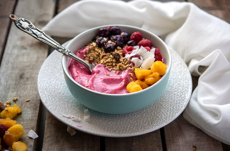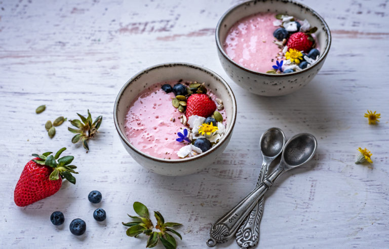 Have a healthy start to the day with these delicious smoothies decorated with toppings of your choice.