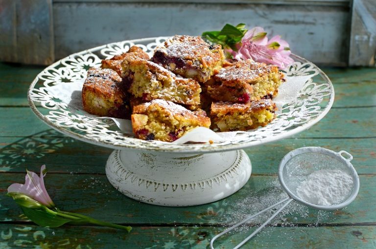 A white chocolate version of a brownie, with macadamias and fruits of the forest.