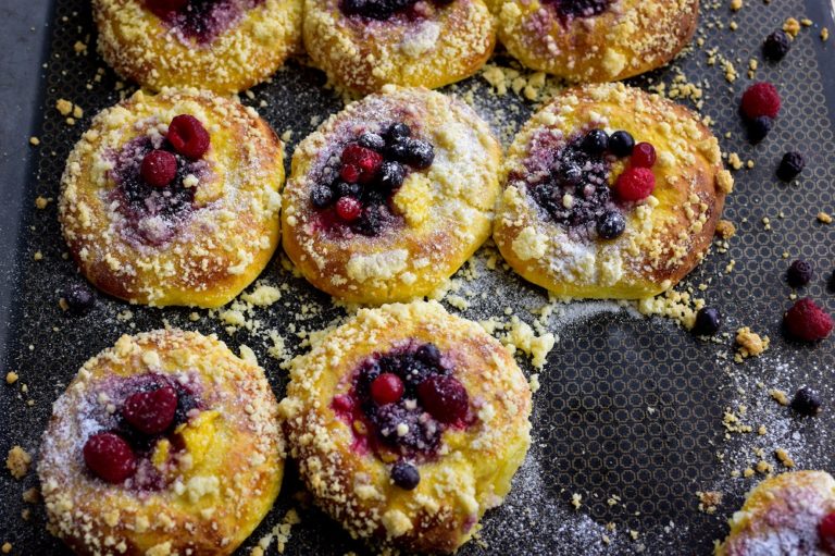 Delicious individual cheesecakes layered with fruit compote and crunchy flapjack.