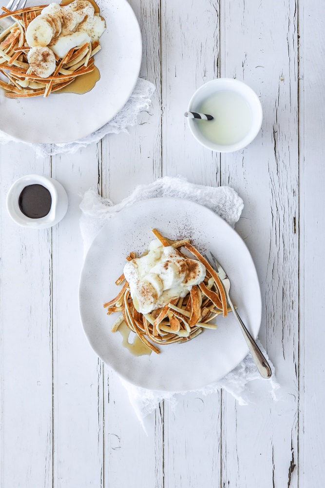 Pikelets, with a twist. Cooked in long twirly, swirly strands, these are as much fun to make as they are to eat.