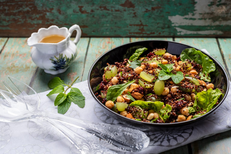 Chickpea & Quinoa Salad This salad has some serious flavours and textures going on. The toasty nuts and chickpeas contrast well with the soft grapes and quinoa.