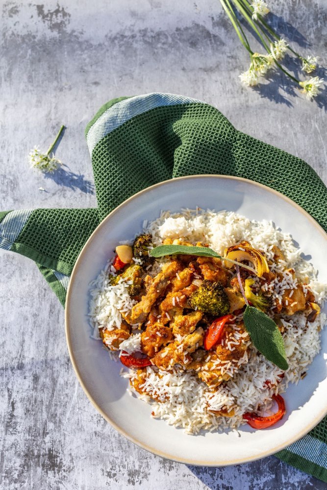 Sweet and tangy chicken served over a bed of rice and topped with a fresh homemade mango salsa.