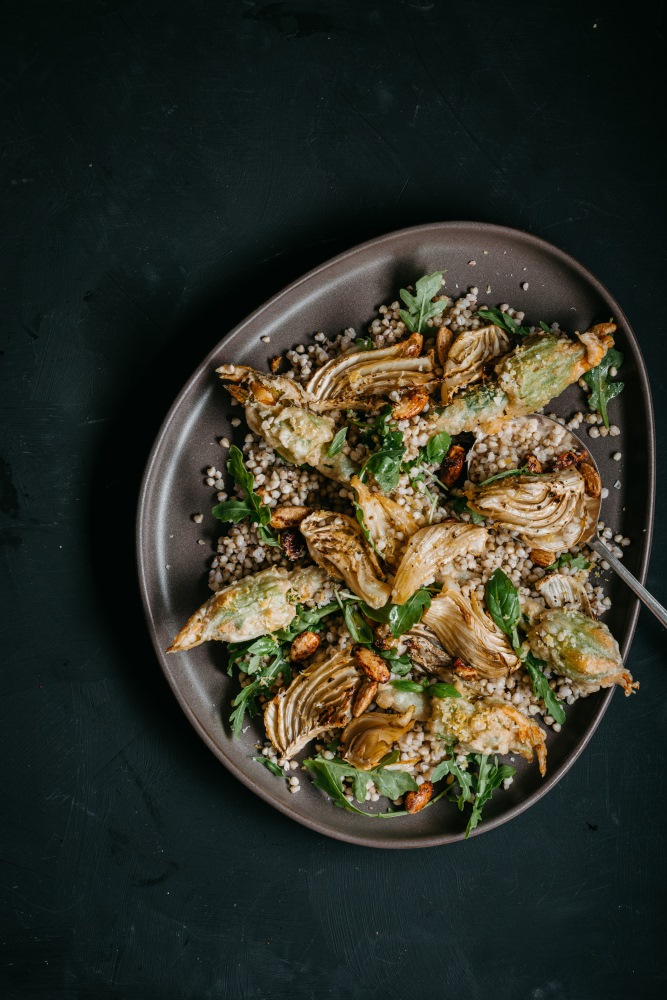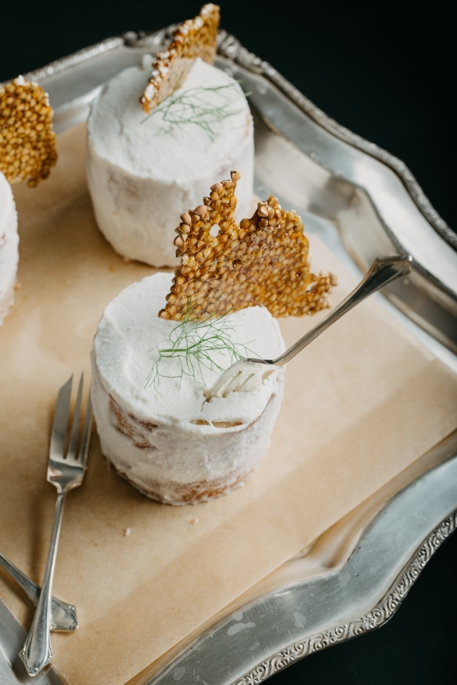 This dish can be a table centerpiece, with its balsamic and honey-glazed vegetables crowning the top of the cake.