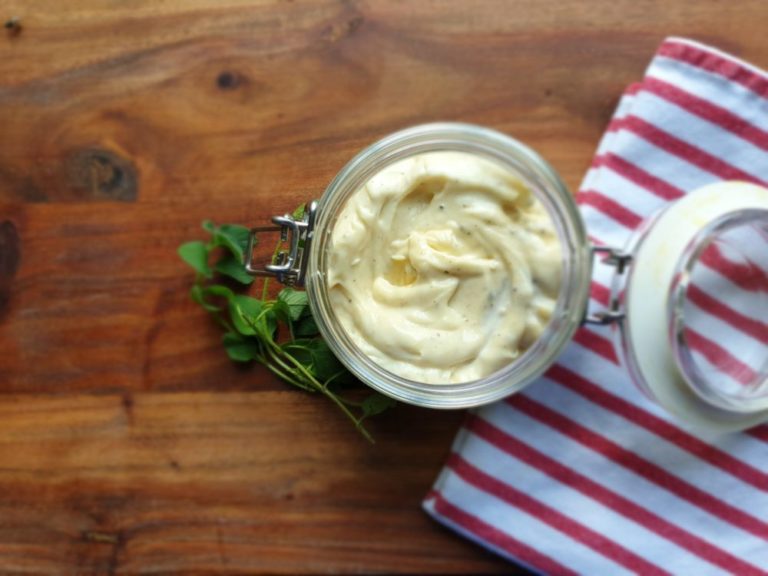 ‘Aioli’ means “garlic and oil”. Some versions, like this one, include egg and lemon juice, making more of a mayonnaise type sauce.