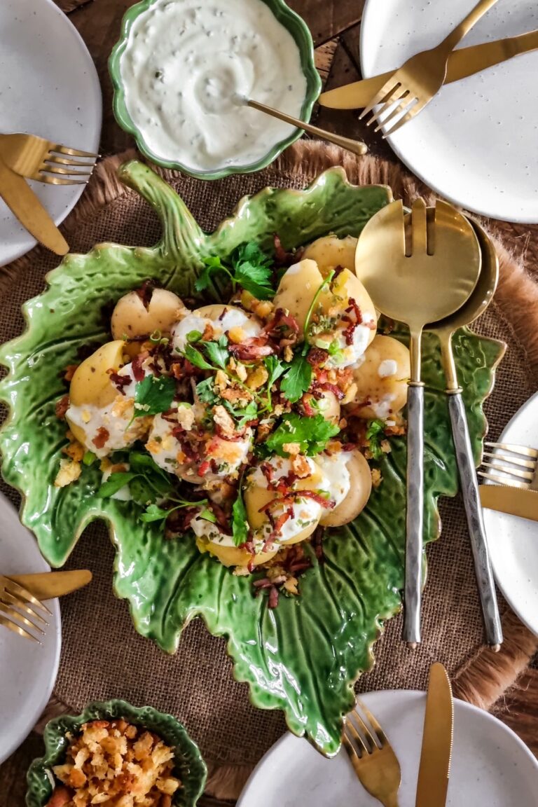 This warm potato salad with a garlicky mayo is a delicious change from regular roast potatoes