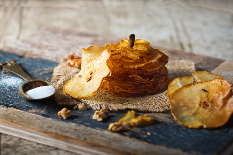 Wafer-thin pears gently baked until crisp and served with brie and powdered pine nut praline – a glamorous appetiser that will wow your guests.