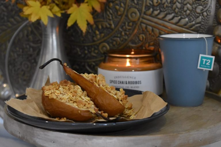 Sweet pears, with some chocolatey goodness topped with a golden crumble.