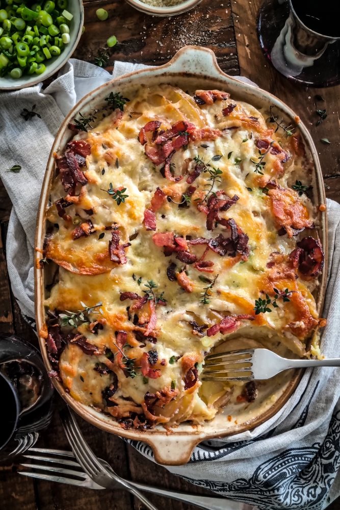 Thin sliced potatoes with a classic creamy sauce topped off with extra cheese and bacon. Total comfort food.