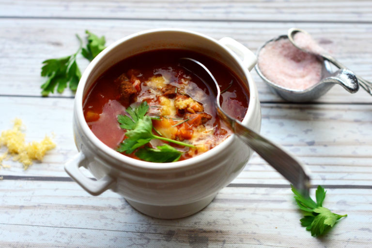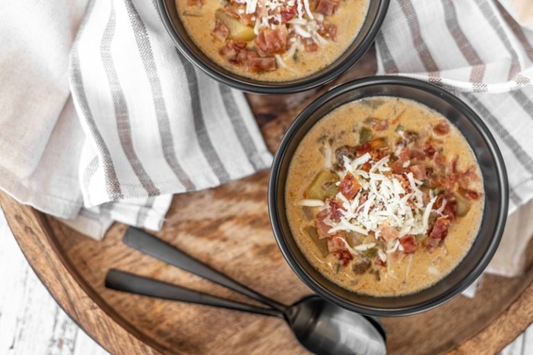 A creamy soup with plenty of beef, cheese and potatoes and just enough spicy kick. This one can’t claim to be low in calories but