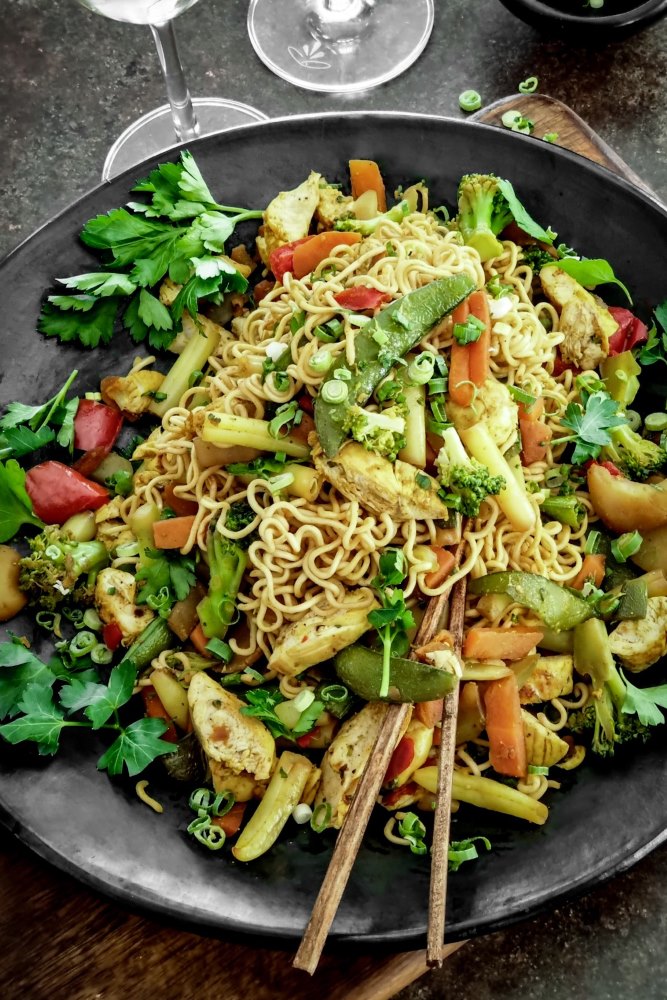 A classic Chinese stir-fry – silken egg noodles and colourful fresh vegetables, in a tangy homemade chow mein sauce. Adding protein of your choice will