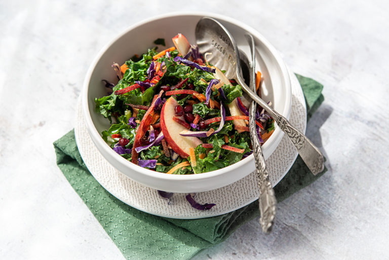 Juicy pomegranate arils have a unique sweet and sour taste that goes well with kale