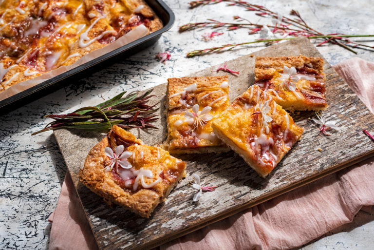 Blondies have white chocolate rather than dark and flavoured with vanilla rather than cocoa. If you don’t have rhubarb, use any compote or jam you