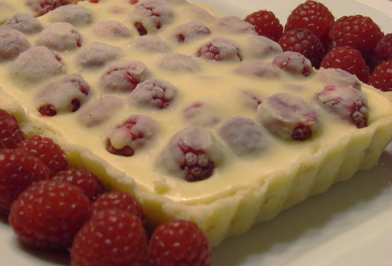 Indulgent white chocolate and fresh raspberry tart