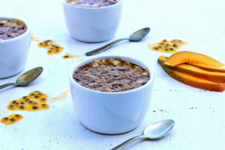 A delicious idea for breakfast or dessert. Fresh mango drizzled with passionfruit then topped with yoghurt with caramelized brown sugar.