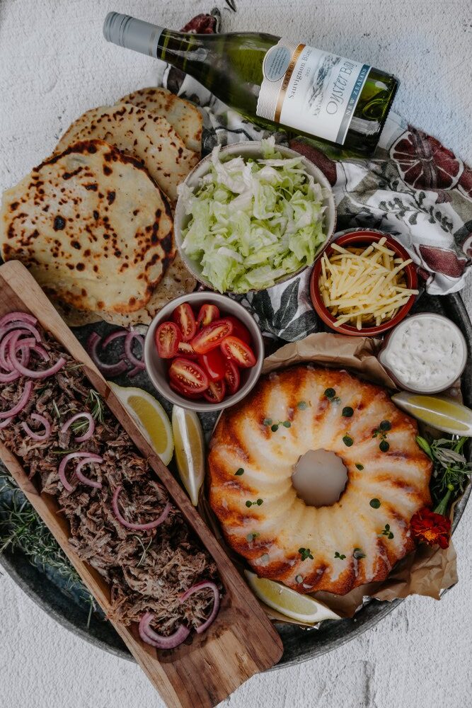 Slow Cooked Lamb with Home Made Naan, Tzatziki & Salad & Lemon Drizzle Cake