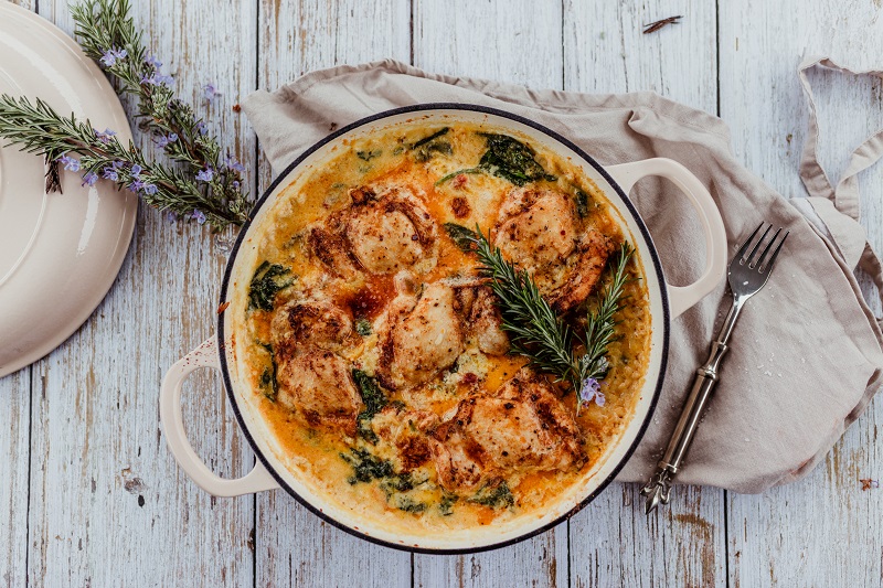 Add the cream, parmesan, Dijon mustard, spinach and sundried tomatoes. Add the chicken and the juices back into the pan and transfer to the oven, uncovered, for 10-15 minutes, or until the chicken is cooked through.