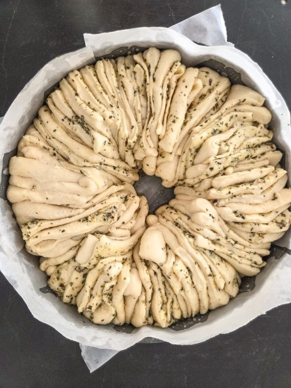 Repeat with remaining dough pieces and remaining garlic butter. Arrange stacks in a lightly greased 24cm/9.4” ring tin, standing up like little books, allowing small gaps between dough pieces.