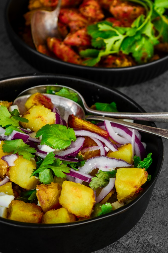 Indian inspired potato cubes loaded up with red onion, feta and coriander for that bit of freshness.
