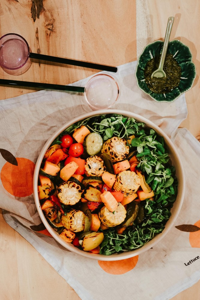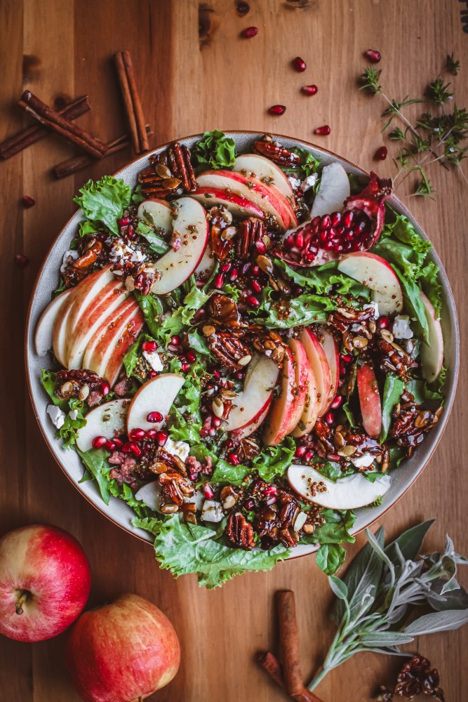 Perfect for fall, colourful, flavourful, spicy, tangy, and sweet! Lettuce, crunchy apples, juicy pomegranate seeds and maple candied nuts, all topped with an apple cider