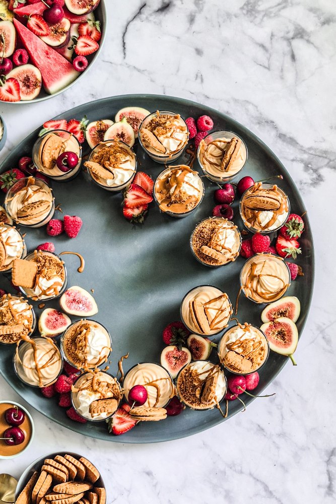 A short order recipe for delicious individual no-bake creamy Biscoff cheesecakes garnished with whipped cream, a drizzle of melted Biscoff and sprinkled with more biscuits…served