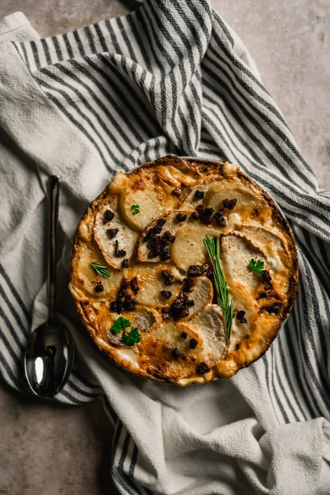This baked celeriac gratin combines creamy layers of earthy celeriac, tender potatoes and rich pancetta with hints of rosemary. Perfect as a cosy side dish,