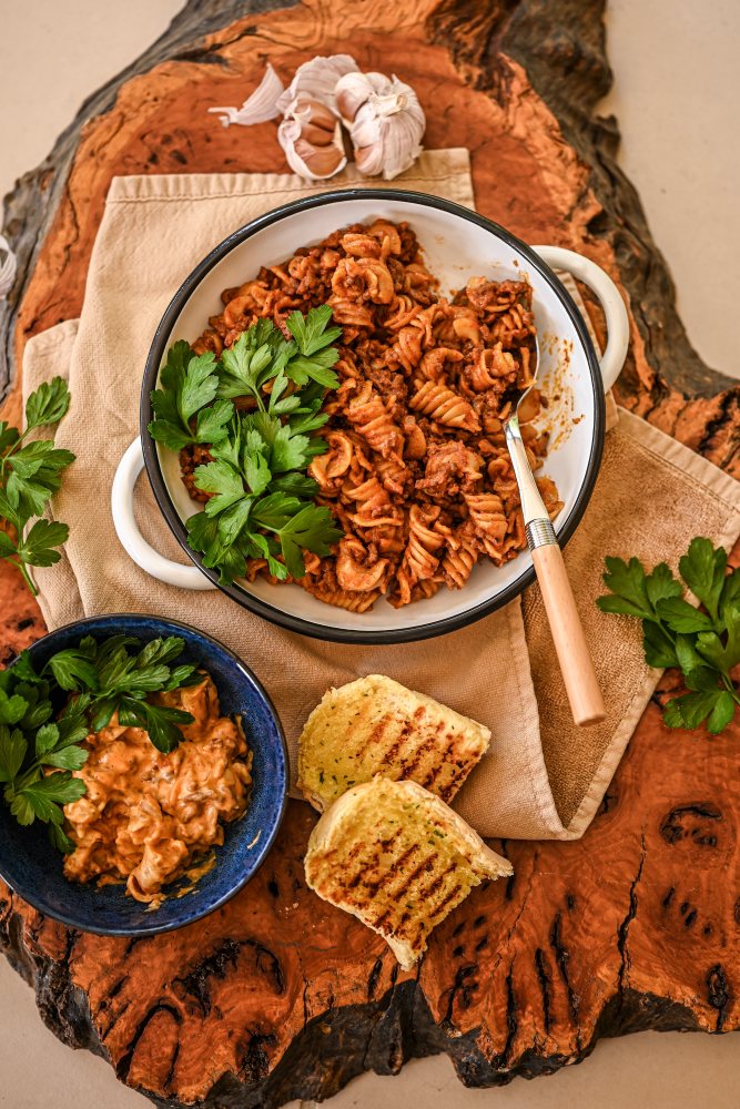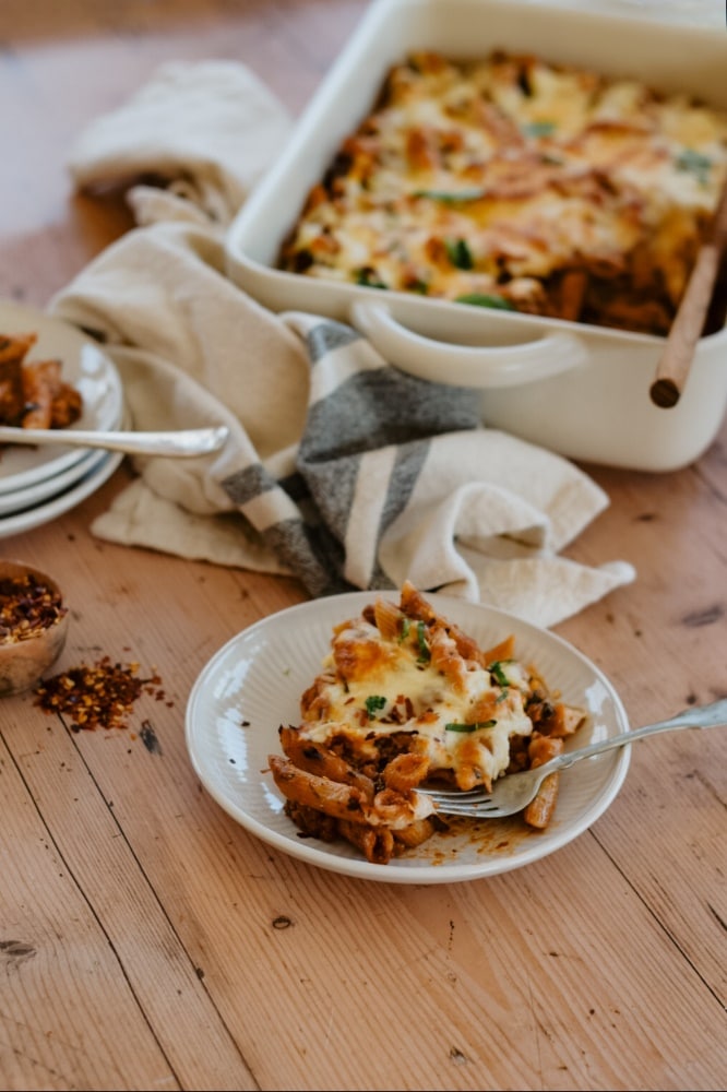 An easy cheesy pasta bake recipe using up leftover turkey, spiral pasta, some veg and a creamy cheesy bechamel sauce with a crunchy cheesy potato